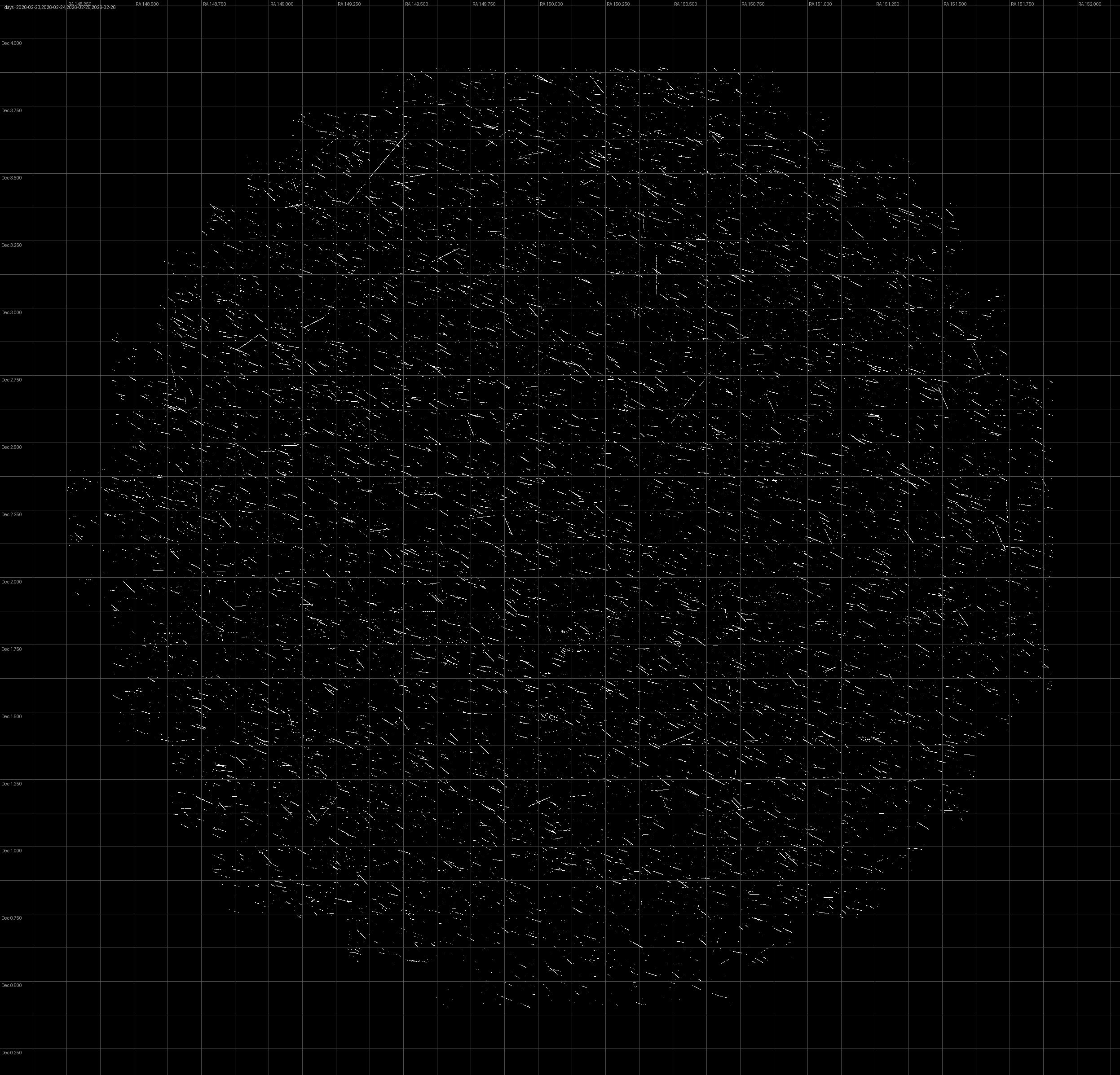 The image uses a simple local planar projection. Alerts were deduplicated by diaSourceId, and each surviving alert was drawn as a single white pixel with no smoothing or intensity accumulation.