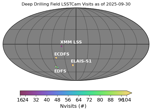 For a quick look, here’s the skymap that plots the number of visits (for all filters) as of 2025-09-30 in the Deep Drilling Fields. It was created with Commissioning notebook tutorial 101.