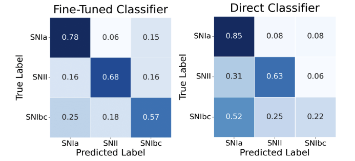 However, before fine-tuning on this dataset, we pretrain our model on classifying 13 classes of simulations. When compared to a classifier trained without this pretraining, we see significant improvements, especially on SN Ibc supernovae, for which we have a lot less data. This is the key finding of our paper on Transfer Learning.