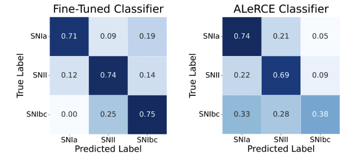 Also note that the Fine-Tuned Classifier figure here is different from the one above as ALeRCE’s classifier has not been run on all objects used to create the figure above.