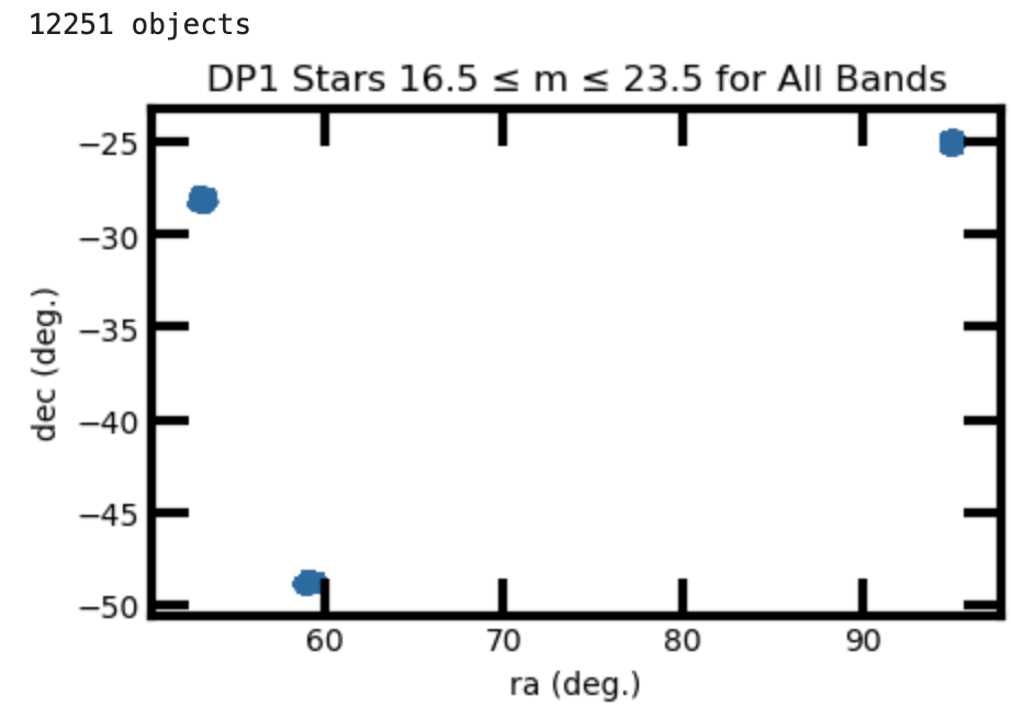 Hi Bob – that would be because of the query’s requirement on all of the ugriz bands (via the 16.5 < mag < 23.5 contraints). If you look at the table of how many observations were obtained in each filter, you’ll see that 3 fields had no u-band, and one field (Seagull Nebula) had u-band but no i-band observations. Thus those fields don’t have any stars meeting your criteria for those bands.