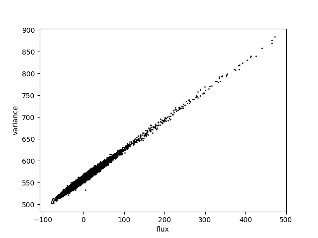 I am doing source injection on visit images in DP1 and I noticed a strange behaviour in the variance maps. Here I have a small cutout (128x128 pixels) before injection and I plot the variance vs the flux:
